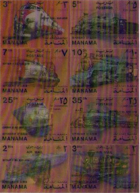 Ogni serie emessa era composta da sei valori ordinari (3, 5, 7, 10, 25 e 35dh), due di posta aerea (2 e 3rl) e due minifoglietti (1 e 3rl)