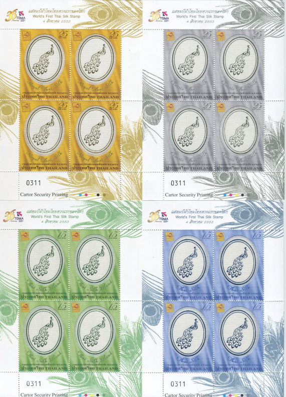 03-02-2009 - Australia: filamenti floccati / flocked filigree 06-05-2009 - Singapore: ricami / embroidery 26-09-2009 - Argentina: feltro giallo sulla pallina / yellow felt on the ball 18-12-2009 - Armenia: feltro verde / green felt 04-08-2010 - Thailandia / Thailand: 1) pavone ricamato con filo di seta marrone su sfondo in seta dorata / peacock embroidered with brown silk thread on golden silk material 2) pavone in rilievo su lamina d'oro, su sfondo di seta bianca (anche non perf.) / peacock embossed on golden foil, on a white silk material (also imperf.) 3) pavone in rilievo, su ovale in seta bianca / peacock foil embossed on a hand-woven silk material 4) sovrastampati 36° TGMA / overprinted 36th TGMA 17-09-2010 - Austria: ricami / embroidery 12-02-2011 - India: tessuto 'khadi' / 'khadi' fabric (presentation pack) Il khadi è un tessuto di cotone filato a mano che Gandhi elesse come simbolo di autodeterminazione ed autosufficienza / Khadi is a hand woven cotton that Gandhi elected as a symbol of self-determination and self-sufficiency 08-10-2011 - Francia / France: quattro merletti prodotti con specificità regionali / four laces product with regional specifics 18-06-2012 - Indonesia: tessuto batik / batik fabric pelle di bufalo / buffalo hide 06-07-2012 - Ungheria / Hungary: rosa con ricamo 'Kalocsa' (solo in versione speciale da folder numerato da 00000 a 09999) 10-06-2013 - Germania / Germany (poste private) corpo dell'elefante vellutato / elephant body flocked like velvet 01-12-2014 - Monaco filamenti floccati / flocked filigree 12-02-2015 - Malaysia: ricami / embroidery (folder - only 10.000) 02-03-2015: Centrafricana / Central Africa le parti floccate in nero danno la sensazione del pelo dell'orso / black flocked areas give a feel of bear fur 21-05-2015: Sao Tomè e Principe parti floccate in blu / blue flocked areas 02-09-2015: Nuova Zelanda / New Zealand stoffa / fabric 24-10-2017: Canada logo in stoffa / fabric logo 11-2017 - Australia filamenti floccati / flocked filigree (only 250 folders) 14-01-2018 - T.A.A.F. parti floccate / flocked parts 24-07-2018: Colombia vela / sail 17-05-2019: Spagna / Spain rete / net