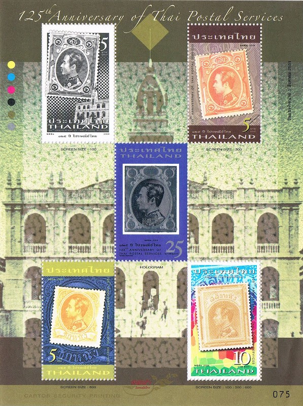 dal 1988 al 1997  dal 1998 al 2000  dal 2001 al 2006  dal 2011 al 2014  dal 2015 al 2018  dal 201905-01-2007 - Perù / Peru (2D holographic foil) 24-01-2007 - Finlandia / Finland (diffraction holographic foil) 05-02-2007 - Perù / Peru (2D holographic foil) 01-07-2007 - Hong Kong (holographic foil) 07-07-2007 - Malaysia (transparent holographic foil) 03-08-2007 - Malaysia (idem overp. BANGKOK 2007) 02-10-2007 - Australia (transparent iridescent holographic foil) 01-11-2007 - Canada (transaparent holographic foil - libretto / booklet) 16-11-2007 - Cile / Chile (laser holographic foil) 05-12-2007 - Thailandia / Thailand 06-12-2007 - Australia (transparent iridescent holographic foil) - overprinted 08-12-2007 - Australia (transparent iridescent holographic foil) - overprinted 27-12-2007 - Perù / Peru (laser holographic foil) 18-01-2008 - Singapore: (transparent hologram foil with morphing effect) questa tecnica, prima al mondo, con un ologramma trasparente ad alto indice di riflessione con effetto "morphing", consente di vedere sul primo francobollo anche l'immagine del passato segno dello zodiaco (il Maiale) e sul secondo quello del futuro segno (il Bue). With this first-in-the-world printing technique on stamps, high reflective index transparent hologram with "morphing effect", one can get a glimpse of next year’s zodiac animal, the Ox, and the outgoing one, the Pig. 23-01-2008 - Macao (laser holographic foil) 01-06-2008 - Turkmenistan 01-08-2008 - Thailandia / Thailand 01/10-08-2008 - Thailandia / Thailand (un foglietto di colore diverso al giorno per 10 giorni/ 10 days 10 colours) 02-08-2008 - Argentina (laser holographic foil) 09-10-2008 - Aland (holographic foil) 09-01-2009 - Singapore (transparent hologram foil with morphing effect) Questa tecnica con un ologramma trasparente ad alto indice di riflessione con effetto "morphing", consente di vedere sul primo francobollo anche l'immagine del passato segno dello zodiaco (il Topo) e sul secondo quello del futuro segno (la Tigre); inoltre, muovendo il foglietto sotto un certo angolo, è possibile leggere due ideogrammi cinesi di augurio. With this printing technique, high reflective index transparent hologram with "morphing effect", you not only get to view the Ox with next year’s zodiac animal (Tiger) and the outgoing zodiac animal (Rat), but you can also by tilting the stamp at a top-bottom angle, view two auspicious Chinese ideograms ("auspicious" and "good fortune"). 02-03-2009 - Liechtenstein (hologram foil with rainbow effect 02-05-2009 - Indonesia (diffraction holographic foil) 30-06-2009 - Giappone / Japan (diffraction holographic foil) 31-08-2009 - Malaysia (transparent holographic foil) 02-10-2009 - Portogallo / Portugal (holographic foil) 02-11-2009 - Canada (transparent holographic foil - booklet) 20-11-2009 - Svizzera / Switzerland (holographic foil) 02-01-2010 - Macao (transparent holographic foil) 08-01-2010 - Singapore (transparent hologram foil with morphing effect) Questa tecnica con un ologramma trasparente ad alto indice di riflessione con effetto "morphing", consente di vedere sul primo francobollo anche l'immagine del passato segno dello zodiaco (il Bue) e sul secondo quello del futuro segno (il Coniglio); inoltre, muovendo il foglietto sotto un certo angolo, è possibile leggere due ideogrammi cinesi di augurio. With this printing technique, high reflective index transparent hologram with "morphing effect", you not only get to view the Tiger with next year’s zodiac animal (Rabbit) and the outgoing zodiac animal (Ox), but you can also by tilting the stamp at a top-bottom angle, view two auspicious Chinese ideograms ("auspicious" and "good fortune"). 28-01-2010: Thailandia / Thailand (transparent holographic foil on booklets) 10-05-2010: Malaysia (holographic foil) 25-08-2010: Costa Rica (transparent laser holographic foil = automatici / ATM) 01-09-2010: Costa Rica (transparent laser holographic foil = automatici / ATM) 20-10-2010: Singapore (laser holographic foil) 03-11-2010 - Svizzera / Switzerland (holographic foil) 09-10-2010: Nigeria 09-10-2010: Nigeria 2010: Nigeria