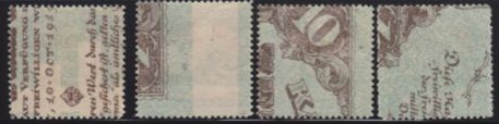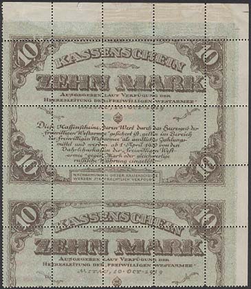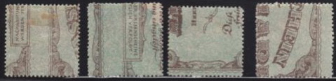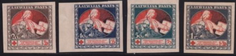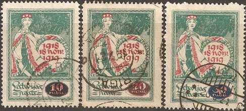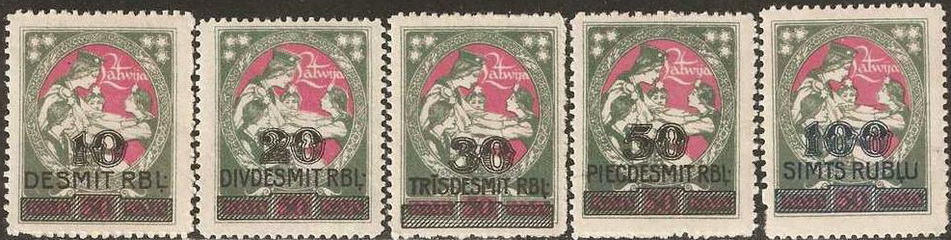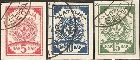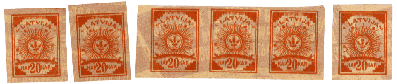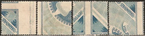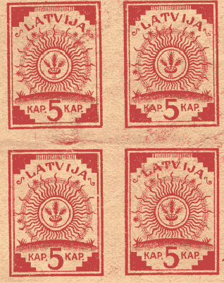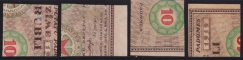 1887 - Messico / Mexico su carta di quaderno a righe (ruled paper) 26-06 / 26-10-1915 - Oaxaca (Messico / Mexico) sul retro di moduli postali (back of post office forms) per queste splendide immagini ringrazio l'amico californiano Bubba Bland... / many thanks to my friend Bubba Bland for giving me these beautiful images from his collection... 1918 - Lettonia / Latvia fogli da 12x19=228 francobolli stampati su "Karte des westlichen Russlands", cioé mappe di guerra tedesche della Russia Occidentale in scala 1:100.000 (backs of German war maps) Le mappe erano di circa 65 zone riferite alla Lettonia e Lituania; alcune erano stampate solo in nero, altre avevano anche delle linee marroni. 1919 - Lettonia / Latvia su carta di quaderno a righe (ruled paper) 1919 - Lettonia / Latvia 'cigarette paper', stampati su etichette di birra, caramelle, ecc. (backs of labels) 1919-1921 - Lettonia / Latvia: su carta da banconote (backs of currency) 5 rubli incompiuti del Consiglio dei Lavoratori e dei Soldati di Riga (blu) 10 marchi del Governo del Colonnello Bermondt-Avalov (verde e marrone) Semi postali "Croce Rossa" con le due precedenti banconote, più i 10 rubli del Consiglio dei Lavoratori di Riga (rosso, verde e marrone) 1921 - Kilis (Turchia/Siria = Turkey/Syria) su carta da sigarette (cigarette paper) 1942 - Guernsey (occupazione tedesca / German occupation) su carta blu per banconote francesi (bluish French banknote paper) 1947 - Andong (ex provincia del nord della Cina) su carta da quaderno (backs of copybook)